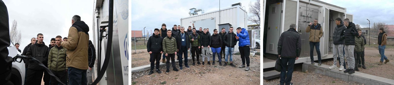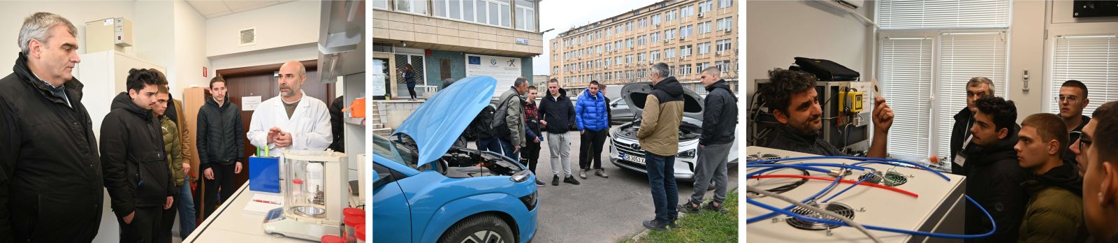 Учениците имаха възможност да посетят и Полева лаборатория „Интегрирани енергийни системи“ към ЦК „ХИТМОБИЛ“, в кв. „Дружба“. Нейният ръководител, доц. д-р Благой Бурдин, представи функциониращите системи за производство, пренос и съхранение на водород за мобилни приложения. Демонстрирано бе зареждане на водороден електромобил от специализирана зарядна станция. Нагледно бе направена и съпоставка за приликите и разликите в устройството на двата вида електромобили – батериен и водороден.